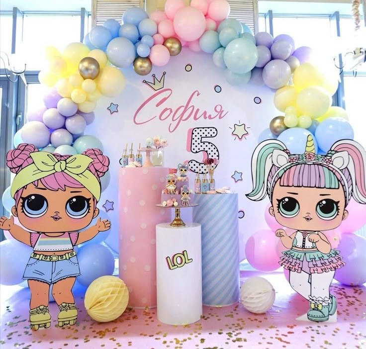 وقتی از تم حرف می‌زنیم، مقصود فقط یک لوگو یا شخصیت نیست؛ تم یعنی زبان بصری جشن. برای تم ال او ال معمولاً پالت‌هایی شامل رنگ‌های صورتی، طلایی، سفید و بنفش ملایم دیده می‌شود، اما می‌توانیم با ترکیب رنگ‌های پاستلی و متالیک ظاهر لوکس‌تر یا شادتر بسازیم.
